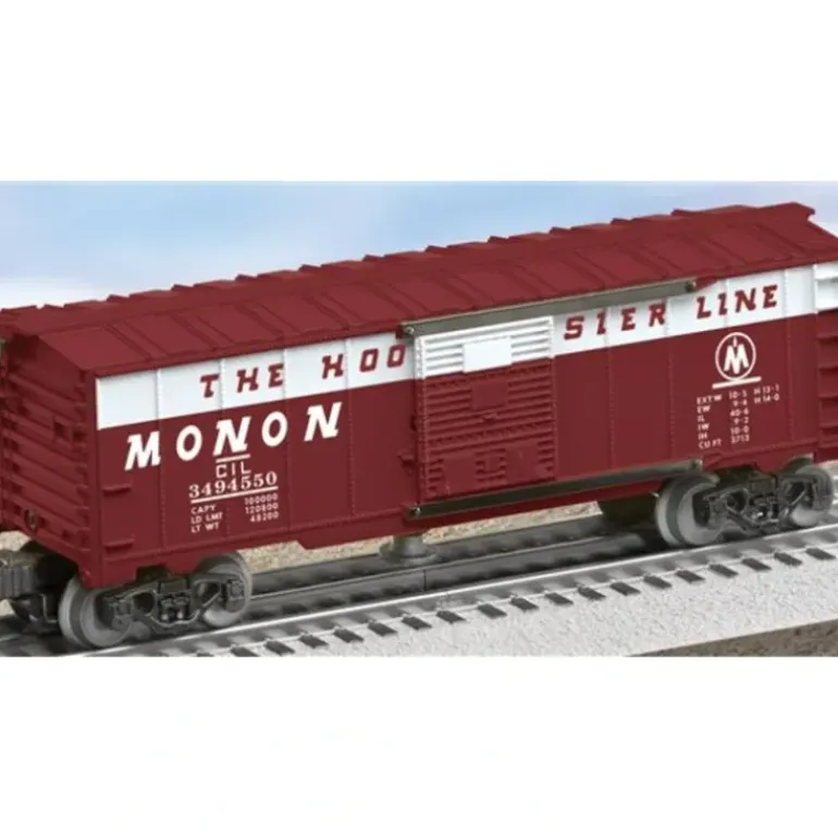 This is a Lionel 6-29856 O Gauge PWC Monon Operating Boxcar #3494-550. Features include operating knuckle couplers, colorful paint schemes, officially licensed, collectible series, perfect additions to Lionel train sets, perfectly sized to match Lionel Traditional and LionMaster Locomotives, minimum Curve: O-27 (Except where noted), Die-cast metal sprung trucks and operating couplers, opening doors, trainman figure emerges, Postwar Celebration Series plaque and packaging, and measures approximately 10 1/4.