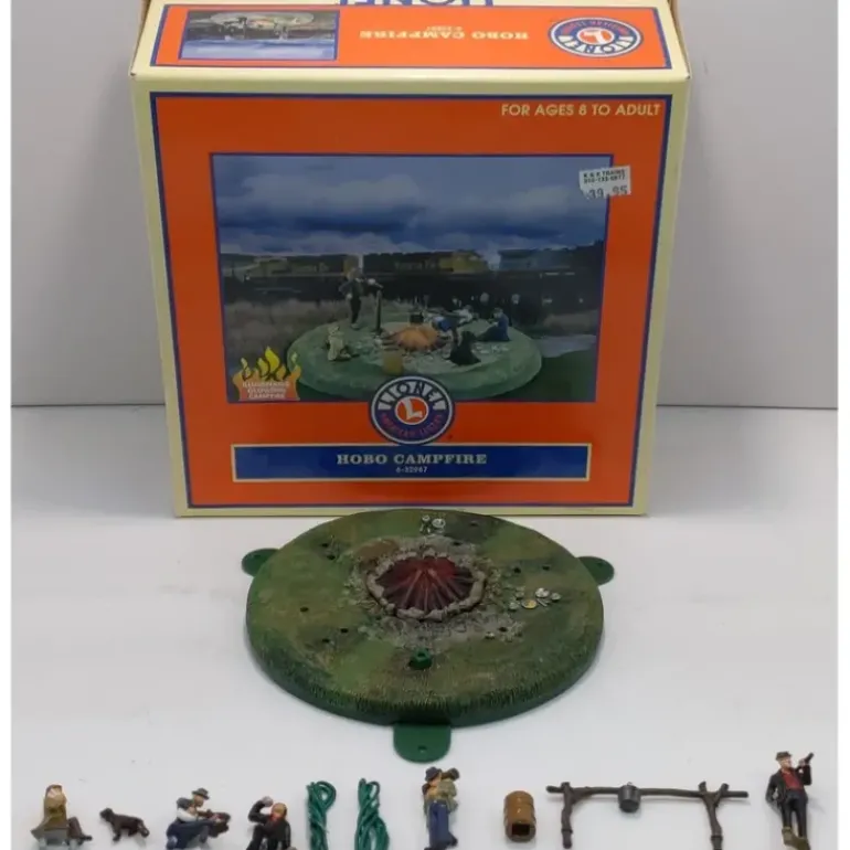This is a Lionel 6-32987 O Gauge Illuminated Hobo Campfire. Features include solid cast pewter figures, trash can, stick and pot, a detailed molded base, two bright flickering LEDs illuminate fire, trash can doubles as on/off switch, base can be mounted from above or below your layout and perforated tabs allow easy detachment if unneeded.