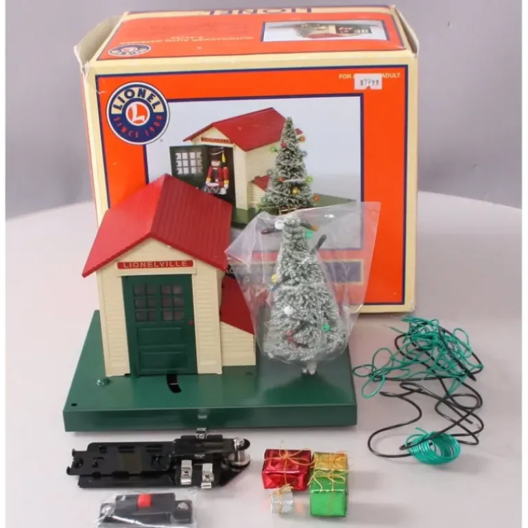 This is a Lionel 6-34164 O Gauge Nutcracker Operating Auto Gateman. The nutcracker emerges from his shed when activated by the weight of a train passing train over the included 153C track contactor, each time the train passes and stands guard next to a lighted Christmas tree. Features a lighted Christmas tree, 153C Contactor, also works with insulated track section (sold separately), FasTrack compatible, comes fully assembled and it measures 7 inches x 5 3/4 inches x 4 3/4 inches.