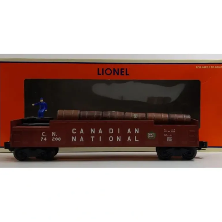 Here we have a Lionel 6-36771 O Gauge Canadian National Operating Barrel Car #74208. This car features a plastic construction, die-cast metal trucks, metal wheels, 6 maple syrup barrels, and operating couplers. This car requires a remote control track section (sold seperately). At the push of a button, the hand-painted figure pushes the barrels off of the car.