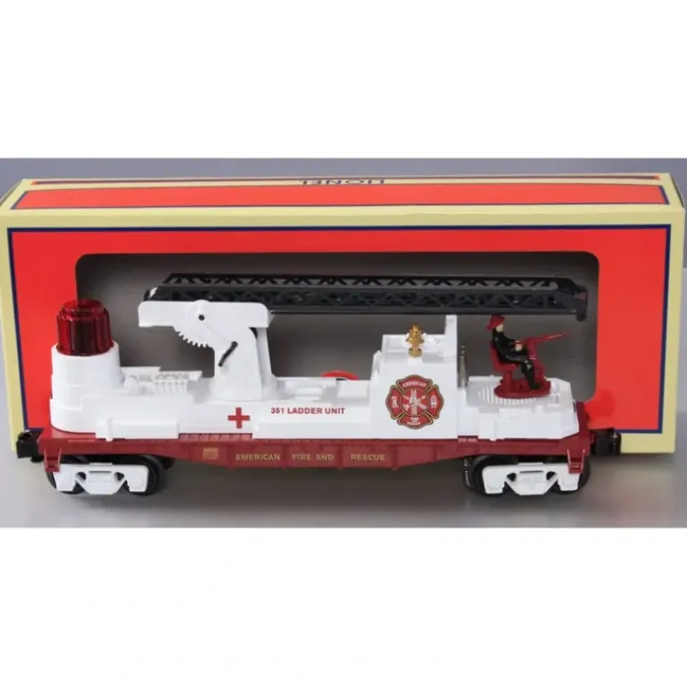 Here is a Lionel 6-36890 O American Fire and Rescue Fireman & Ladder Car #351. This car features die-cast metal sprung trucks, metal wheels and axles, operating knuckle couplers, two metal ladders, three vertical nozzles, oscillating fireman and flashing light.