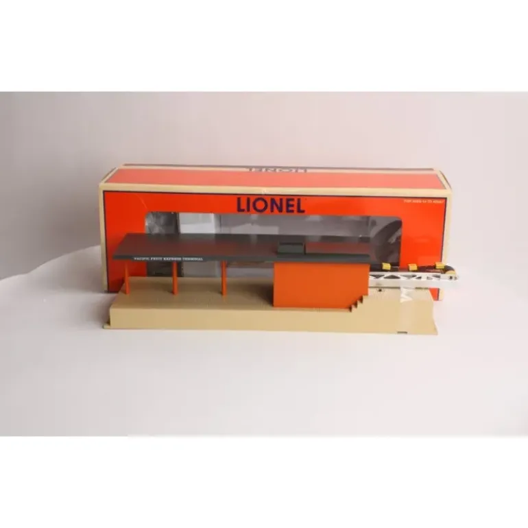 This is a Lionel 6-37975 O Operating Freight Terminal, SP. Many railroads used their own packing and shipping facilities to expedite deliveries of time crucial items. Lionel has chosen popular southwest region railroads and produce companies for this exciting accessory. Imagine processing and packaging shipments for your very own railroad. Watch as the boxes travel down the conveyor to be loaded for departure and delivery to all the people in your towns.