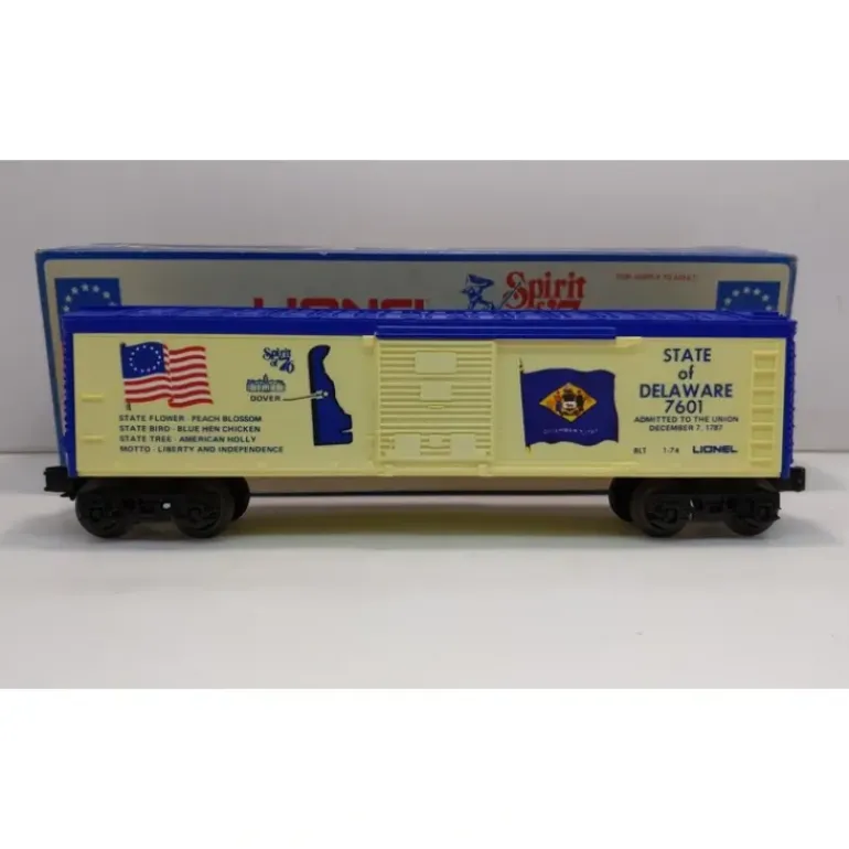 Here is a Lionel 6-7601 O Gauge State of Delaware Boxcar #7601. This car is the from the famous Lionel Bicentennial Set from 1974-76. The complete set includes the 1776 U36B Diesel, 13 boxcars numbered 7601 through 7613, each one commemorating one of the original 13 states in order of their admission to the Union, and the 7600 Caboose. This is a very sharp set and the decorations are attractive and well done. This car features sliding doors, plastic trucks, operating knuckle couplers and metal wheels and axles.