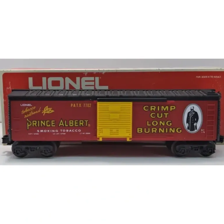 This is a Lionel 6-7702 O Gauge Prince Albert Billboard Boxcar from 1976-77. This boxcar features sliding doors, plastic trucks, fixed knuckle couplers and metal wheels and axles.