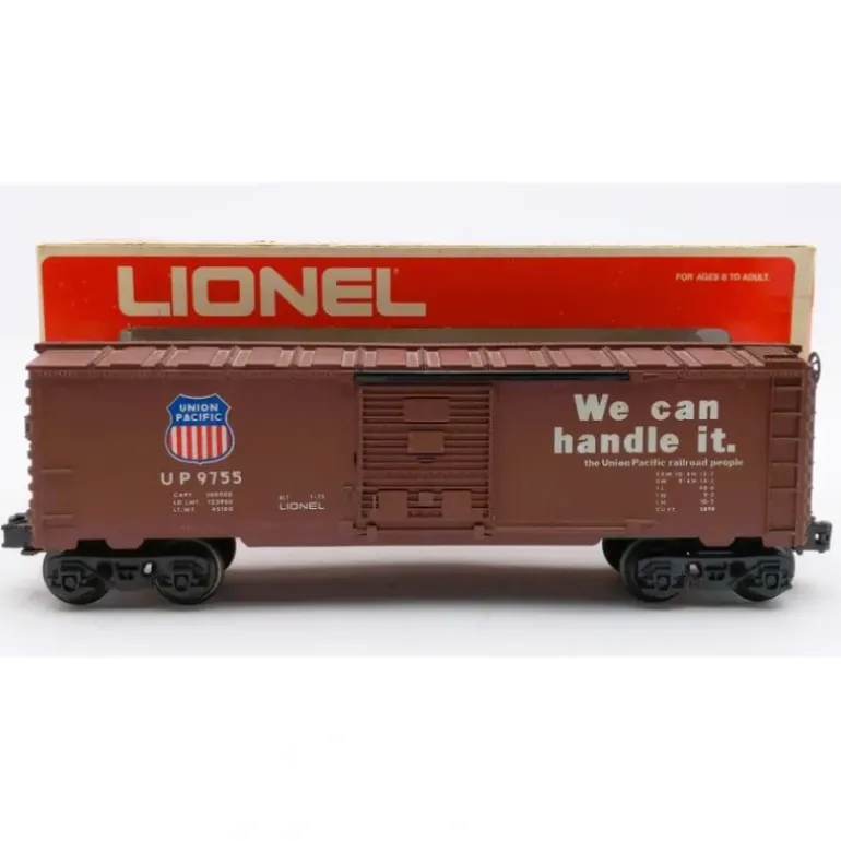 This is a Lionel 6-9755 O Gauge Union Pacific Boxcar from 1975-76. This boxcar features a plastic construction with sliding doors, plastic trucks, metal wheels and axles, and operating knuckle couplers.