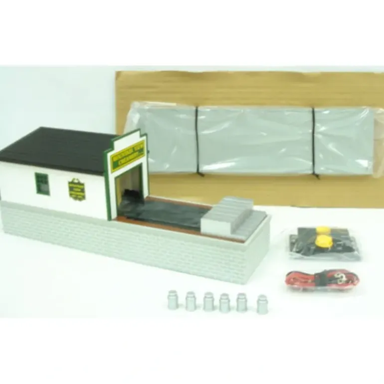 This is a Lionel K-Line 6-21675 O Mountain View Creamery Loading Depot. Milk Depot automatically loads the milk cans through side-door into the waiting Milk Reefer (sold separately) – no manual loading through the roof hatch. Milk cans are transported inside the car and unloaded out the opposite side to the platform anywhere on the layout. All done with a smooth-operating motor. No flying milk cans. Dimensions: 12.5 x 3.5.