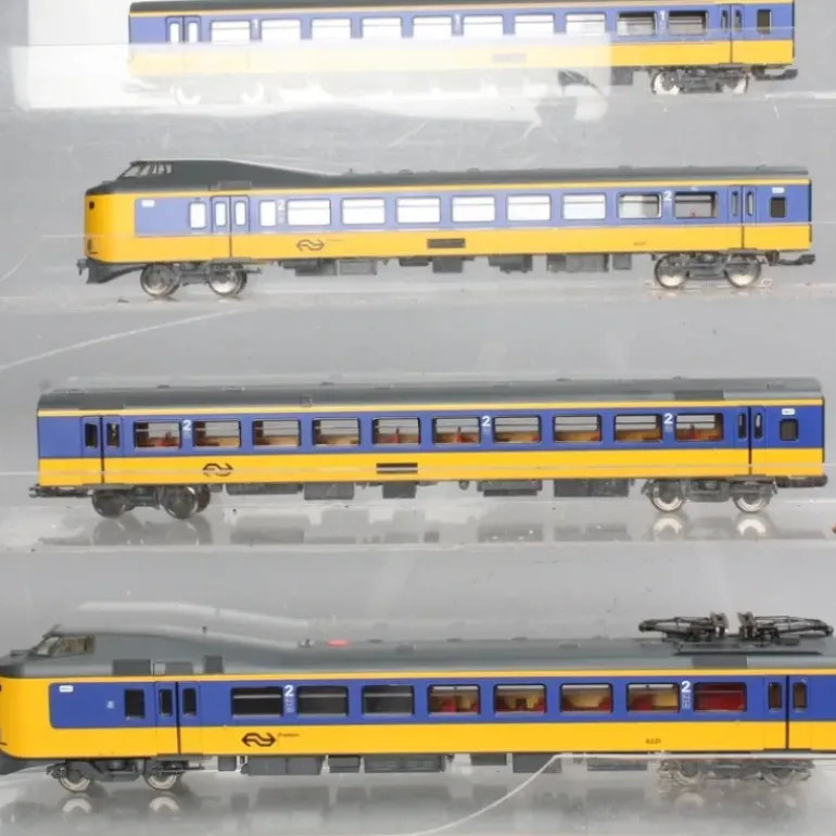 Here is a Marklin 37421 HO Scale NS Koploper Railcar Electric Train Set. The train is the four-part version. The powered end car has a die-cast frame. The train has an mfx decoder. The train has a 5-pole can motor with a skewed armature and a flywheel, and a sound effects generator. The engineer’s cabs in both end cars have interior details. 2 axles in one truck powered. Traction tires. The train has power pickup in the end car at the front of the train; the power pickup changes with the direction of the train. The train has special close couplers with a guide mechanism. The train has factory-installed interior lighting. Prototypical light yellow LEDs are used for the headlights. Warm white LEDs are used for the interior lighting. The interior details vary with the type of car. The headlights, dual red marker lights, and the interior lighting can be controlled digitally. The construction of the running gear and the bodies is detailed. There is a representation of the Scharffenberg coupler with a cover on the end cars. A rigid drawbar coupling is included for multiple unit operation. The end cars come from the factory with closed crossover doors. A plug-in part included with the train makes it possible to represent swinging doors with a diaphragm pushed to the side on one end car. Total train length 114.8 cm / 45-3/16.