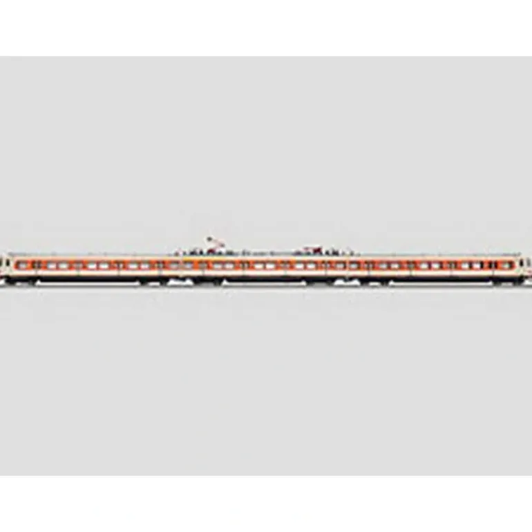 The train has an mfx digital decoder and a sound generator. It also has a 5-pole skewed armature motor with a flywheel, centrally mounted. Four axles on the intermediate car are powered through cardan shafts. The frame for the intermediate car is constructed of die-cast metal. The lighting is done with warm white LEDs, and it will work in conventional operation. Triple headlights and dual red marker lights change over with the direction of travel. The end cars have a pickup shoe changeover feature so that the pickup shoe at the front of the train is the one picking up power. Lighted destination signs along with the headlights / marker lights can be controlled digitally. There is a close coupler guide mechanism and electrical connections between the cars. The special coupling included with the train allows it to be coupled to other ET 420 units for prototypical operation. The train has factory-installed interior lighting. The bodies for the train are made of highly detailed plastic with many separately applied details such as grab irons, electrical connections, windshield wipers, antennas, whistles, and horns. The train has a multi-color interior. The ends of the train have a detailed representation of the Scharfenberg coupler (a dummy coupler). Different authentic destination signage is included with the train. Length over the couplers 77.5 cm / 30-1/2 inches.