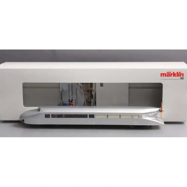 Propeller-driven Kruckenberg Rail Zeppelin. The unit looks as it did in 1931 on the German State Railroad Company (DRG). The unit has a built-in mfx digital decoder mfx with extensive sound functions. It also has built-in interior lighting as well as dual headlights. Vehicle length approximately 28.5 cm / 11-1/4. mfx digital decoder. Motor sounds can be controlled digitally. Built-in interior lighting. Powered propeller on the rear of the unit can be turned on/off separately.
