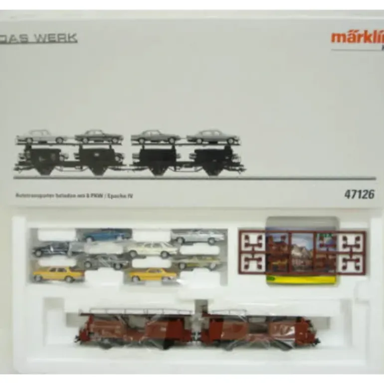 Here is a Marklin 47126 Auto Transport Car w/ 8 Automobiles. Features include plastic and metal construction, telex couplers and metal wheels. This new car transport is for the Mercedes Benz types W116 and C107. The vehicles included are 4 models of the W116 sedan (1972…1980). and 4 models of the C107 2-door coupe (1971…1981). The upper decks are made of metal and can be lowered. The cars are loaded with a total of 8 model automobiles made of metal. Both automobile types come in different exclusive paint schemes. Suitable chock blocks are included. This is a one-time series for the theme Auto Plant.