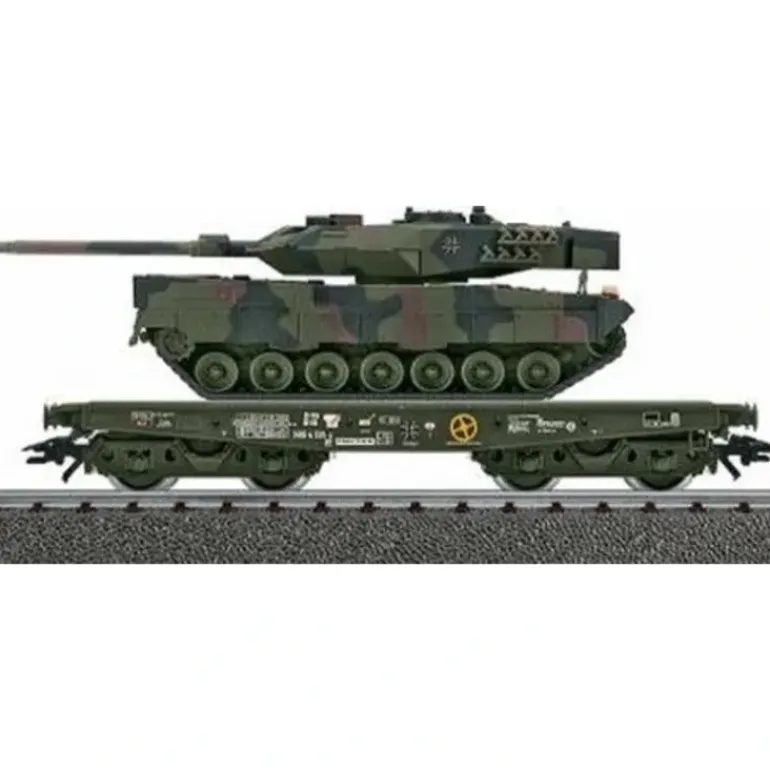 This is a Marklin 48711 Rimmps Flatcar with Leopard II Tank Load. It features intricately realistic details, metal wheels, metal couplers, and attractive decoration.
