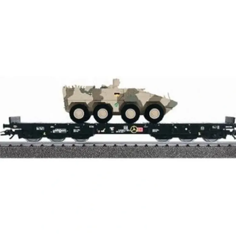 This is a Marklin 48735 4MFOR Flatcar with an ISAF Boxer. It features intricately realistic details, metal wheels, metal couplers, and attractive decoration.