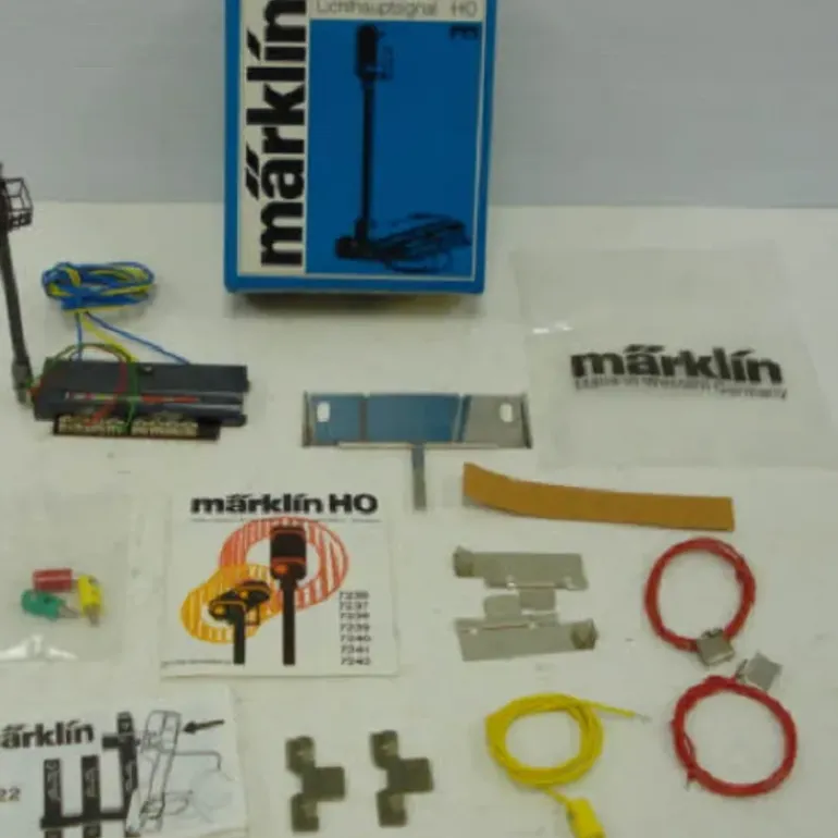 Here is a Marklin 7240 HO Scale Home Light Signal. It features 8 connectors and 3 multicolored lights. It measures 3 3/4″ tall.