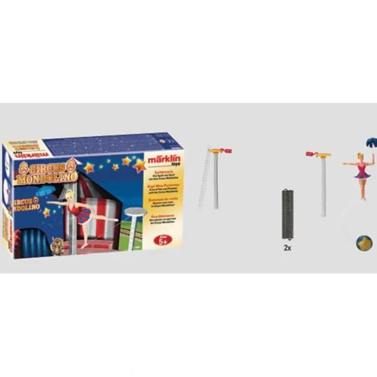 Model: The complete high wire equipment to go with the Mondolino circus tent, including the high wire performer, who can stand on the wire as well as in the ring. Contents: 1 high wire performer with an umbrella and a counterweight to stand on the wire, 2 masts, 2 platforms, 1 high wire to hook on to the masts, 1 ladder, 2 no. 24172 straight track. Cardstock cutout sheet for a springboard and a ring of fire.