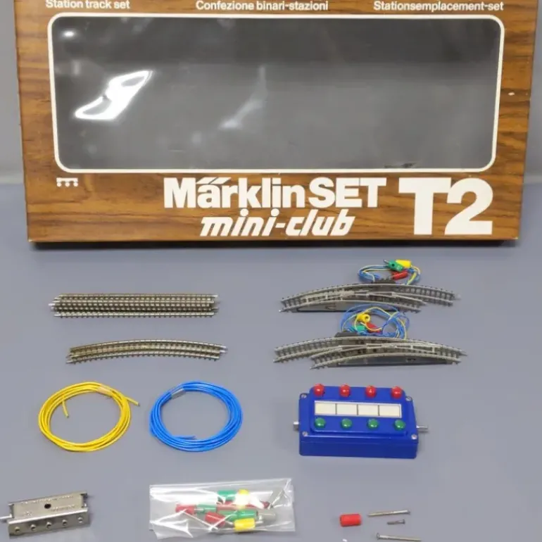 Here is a Marklin 8193 Z T2 Station Track Set. Includes straight tracks, curved tracks, electric curved turnouts, a control box, a distribution strip, wire, plugs and sockets, and instructions. The SET extension set program is a progressive system with which you can expand track layouts from the starter sets in steps. The E 8190 or E 8191 is used to expand the 81530/81535 or 81562 set. You can then systematically expand in any sequence desired with the T1 8192, T2 8193 and T3 8194 track extension sets. When you start off with the 81781/81785 starter sets, you already have the E 8191 track extension set integrated into the starter set, and you can then easily expand further with the T1 8192, T2 8193 and T3 8194 track extension sets. The 8198 catenary set for S+E and 8199 set for T1+T2+T3 make it easy to add working catenary operation in the SET program so that two trains can be controlled independently of each other on a track.