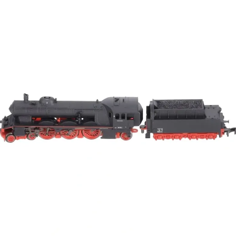 This is a Marklin 88184 Z Scale German Federal Railroad (DB) Class 18.1 Express Locomotive with a Tender. This model has been extensively reworked and is finely detailed. The locomotive body and frame are constructed of metal. The imitation of the brakes, the sand pipes, rail clearance devices, etc. on the underside of the body are finely modelled. The valve gear and rods are finely detailed. The locomotive and tender have larger buffer plates. The locomotive has a 5-pole motor. All 3 driving axles are powered. The locomotive has dual headlights. The tender has spoked wheels. Length over the buffers approximately 112 mm / 4-3/8.