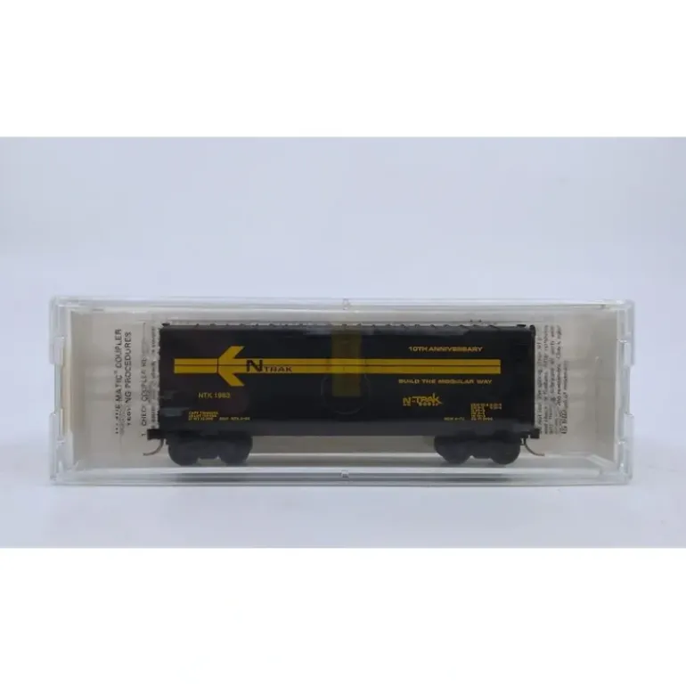 This is a Micro-Trains 83-01 N Scale Ntrak 10th anniversary Boxcar #1983. This item displays a plastic construction.