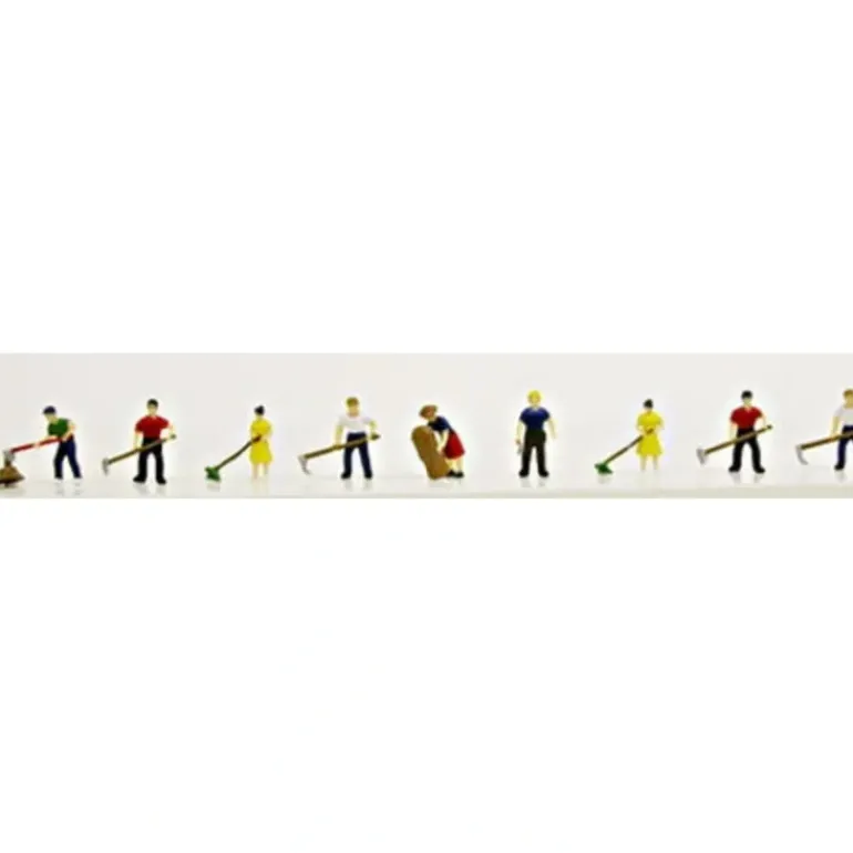 Set of 9 Plastic Farm Action People for use with N Scale Railroad Layouts and Diorama Settings. Features: Molded N scale plastic pieces, Hand painted farm people in action poses, Men and women, Bring your model layout, farm, and gardening scenes to life. Includes: Nine N Scale Plastic Farm Action People. Scale: N 1:160. Comments: You may want to glue these figures to your layout to secure standing or sitting positions.