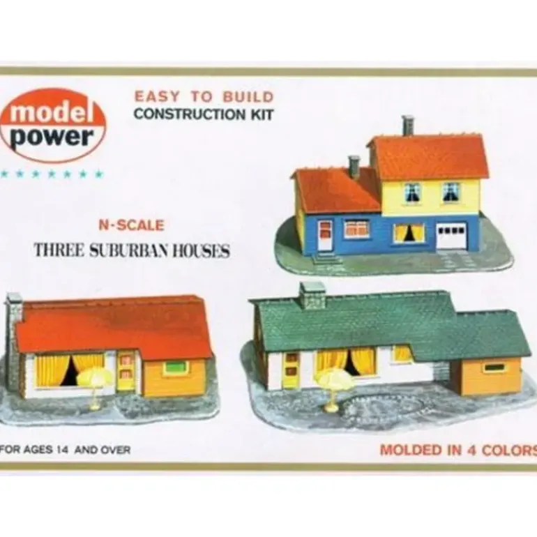 This is a Model Power 1502 Suburban House 3-in-1 Building Kit. This is a Trio of Plastic N Scale Suburban Houses to Assemble from Model Power. Model Power designed this easy to build N Scale Suburban House kit for use in your N SCALE railroad layouts or dioramas. Ages 8 and over. Features: Molded in four realistic colors, Assembly time (20 minutes to 2 hours–depends on modeler’s skill), Excellent detailing with extremely precision fit, #1–blue and yellow tri-level with red roof and single garage, #2- White and Tan single story house complete with red roof and fireplace, #3- White and Tan single story house complete with Gray roof and pond. Includes: One 3 pack set of Suburban Houses (Unassembled). Requires: Plastic Model Cement TESR1621, Modeling Knife.