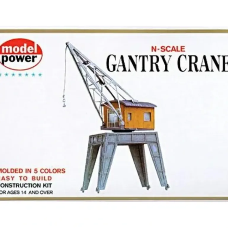 Gantry Crane — 1-3/4 x 1-3/4” 4.4 x 4.4cm. Features: Plastic pieces molded in 5 different colors, Easy to build, Realistic detail, Crane is mounted to a small building which rests on top of a four footed platform, Building rotates 360 degrees on top of platform, Anchor-like plastic hook, Crates and barrels for added detail to the grounds area, Pictorial assembly instructions given for assistance. Includes: One N Scale Gantry Crane Construction Kit. Scale: N 1:160.