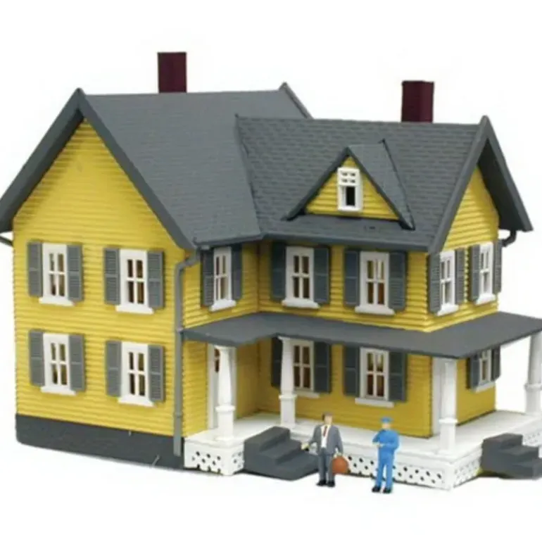 Features: Built up plastic building (lighted), Very realistic with fantastic detailing, Includes two miniature figures and extra shutters, It resembles an old fashioned home (big with lots and lots of room), The three-story farmhouse has yellow clapboard siding, grey shutters, wrap-around white front porch, complete with pillars and trellis, two red chimneys, white windows, and an attic. Includes 1- Grandma’s House (Assembled–**N SCALE**).