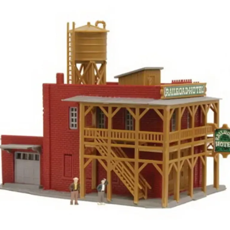 For Adult Model Railroaders. Features: Two story red brick-look building with a grey roof, One side has clear plastic windows only on top with the windows on the bottom having a bricked-in appearance. The other side has windows on both top and bottom, The second story has a wooden balcony with staircase that goes around the front and one side, Front features windows on top level, double wood-look doors on bottom, and two signs stating Railroad Hotel, Roof has a small shed-type structure which is meant to give access to the roof, and a large wood-look water tower, There is a small red brick-look garage at the rear of the building which has a grey door, corrugated steel-looking roof and overhang, and a door and windows in the back, Two extremely small hand-painted figures are included with the building, The lighted building is pre-wired. Includes One N Scale Lighted Plastic Railroad Hotel Built-Up Building with Figures. Scale: N (1:160) Length: 5 (127mm) Width: 3 (76mm) Height: 3-1/2 (89mm).