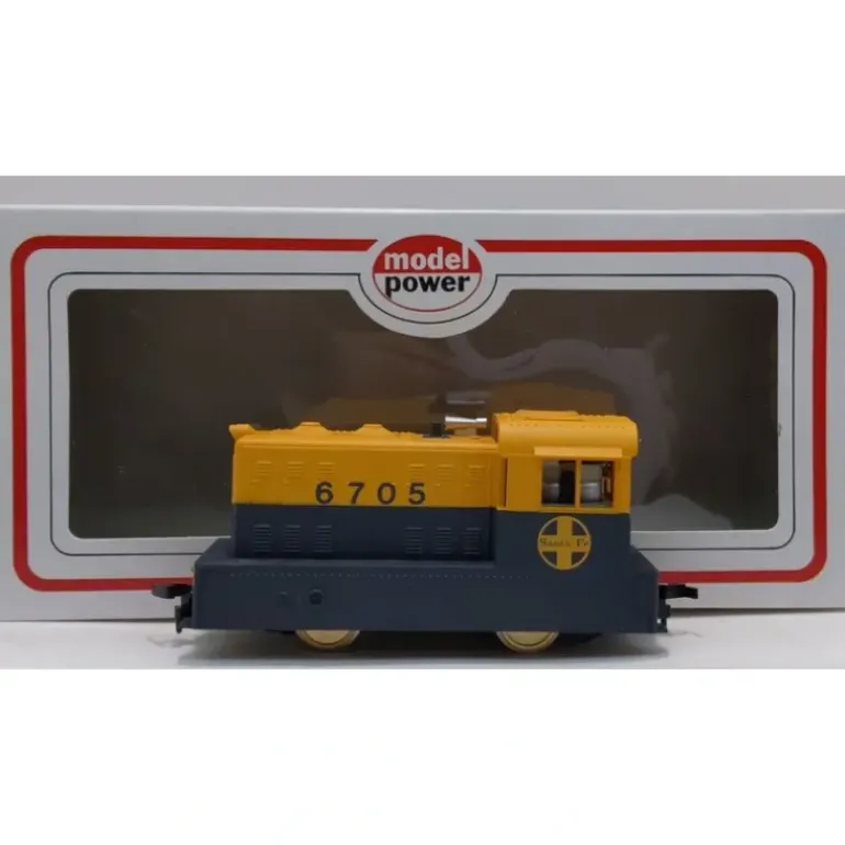 Here is a Model Power 6705 HO Scale ATSF Porter Hustler. This locomotive features intricately realistic detail, metal wheels, attractive decoration, and a powerful motor.