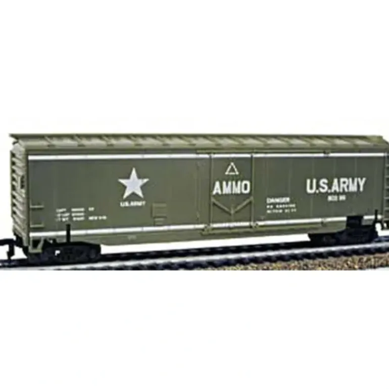This is an HO Scale US Army Exploding Boxcar from the Military Action Series by Model Power. Features: Compatible with any HO scale train equipment, Detailed car body is molded in olive green plastic, Looks like an ordinary box car until hit by a missile (missile not included), When a missile hits the ammo carrying boxcar, it explodes!, Upon missile impact, car sides and top will explode from car base, Roofwalk, ladders, and brakewheel are molded in detail, U.S. Army 80299, AMMO, U.S. Army logo in white on each side, Detailed undercarriage, Free-rolling wheels. Includes: One HO Scale US Army Exploding Boxcar. Adult Supervision. Scale: HO 1:87. Length: 7 (178mm). Width: 1-3/8 (35mm). Height: 2-1/8 (54mm)