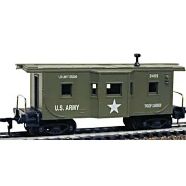 This is an HO Scale US Army Caboose from the Military Action Series by Model Power. Features: Detailed caboose body is molded in olive green plastic, Details in molding include roofwalk, chimney, safety lantern, and grab rails, Black steps and walkways with silver metal railings, Four windows on each side, U.S. Army, Troop Carrier, star, and 3455 in white on each side, Detailed undercarriage, Free-rolling wheels. Includes: One HO Scale US Army Caboose. Requires: HO Scale Train Set, Maintenance Equipment, Adult Supervision. Scale: HO (1:87). Length: 4-1/4 (108mm). Width: 1-3/8 (35mm). Height: 1-7/8 (48mm). Comments: Choking Hazard: Keep away from children under 3 years of age.