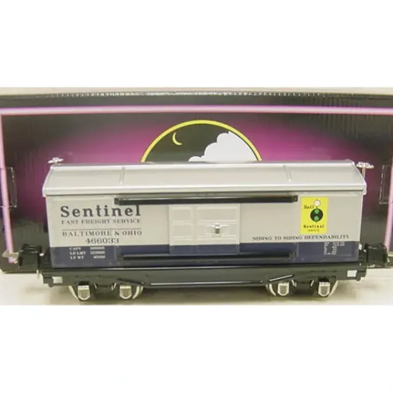 This is an MTH 10-8026 Baltimore and Ohio 2814 O Gauge Boxcar. Features include baked enamel finish, stamped steel body and chassis, metal wheels and axles and an operating coil coupler.