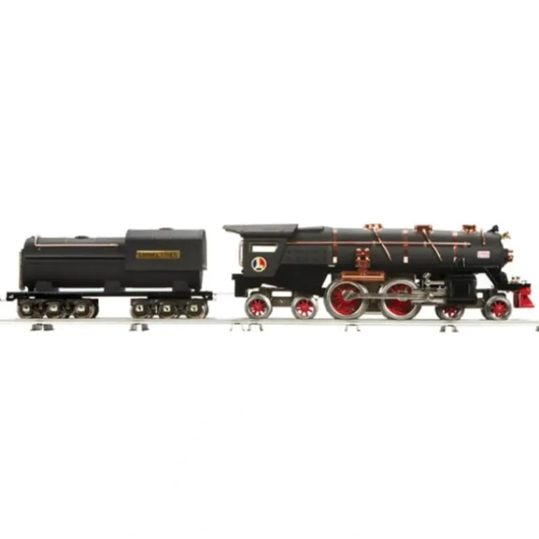 This is made by MTH and is part of the new Lionel Corporation Tinplate Line. 400E Tinplate Steam Engine (Traditional) – Crackle Black (Brass Trim). Baked Enamel Finish. Colorful Paint Scheme. Metal Wheels and Axles. Operating Metal Latch Couplers. Bild-A-Loco Motor. Metal Handrails and Decorative Bell. Nickel Trim. Die-Cast Metal Chassis. Stamped Steel Boiler. Stamped Steel Tender. Track Voltage Operating Headlight. Unit Measures:32 1/2 x 4 1/4 x 5 3/4. Operates On STD-42 Curves.