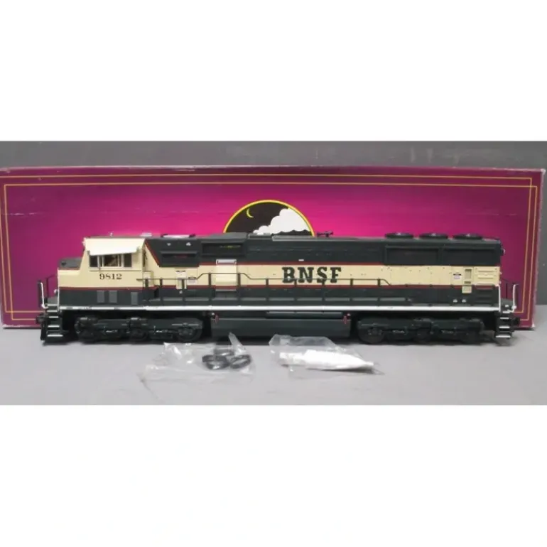 Here is an MTH 20-2956-1 BNSF SD70Mac Diesel Engine w/PS2(Hi-Rail Wheels). This locomotive features two remotely controlled ProtoCouplers, a metal chassis, illuminated number boards, two precision flywheel equipped motors, an intricately detailed ABS body, directionally controlled headlights, die-cast trucksides, die-cast pilots, die-cast fuel tank, an authentic paint scheme, metal handrails, decorative horn, lighted cab interior, two engineer cab figures, metal body side grilles, operating smoke unit, metal wheels, metal axles, metal gears, locomotive speed control in scale MPH increments, ProtoSound 2.0 with the Digital Command System featuring Freight Yard ProtoEffects and it operates on O-42 curves.