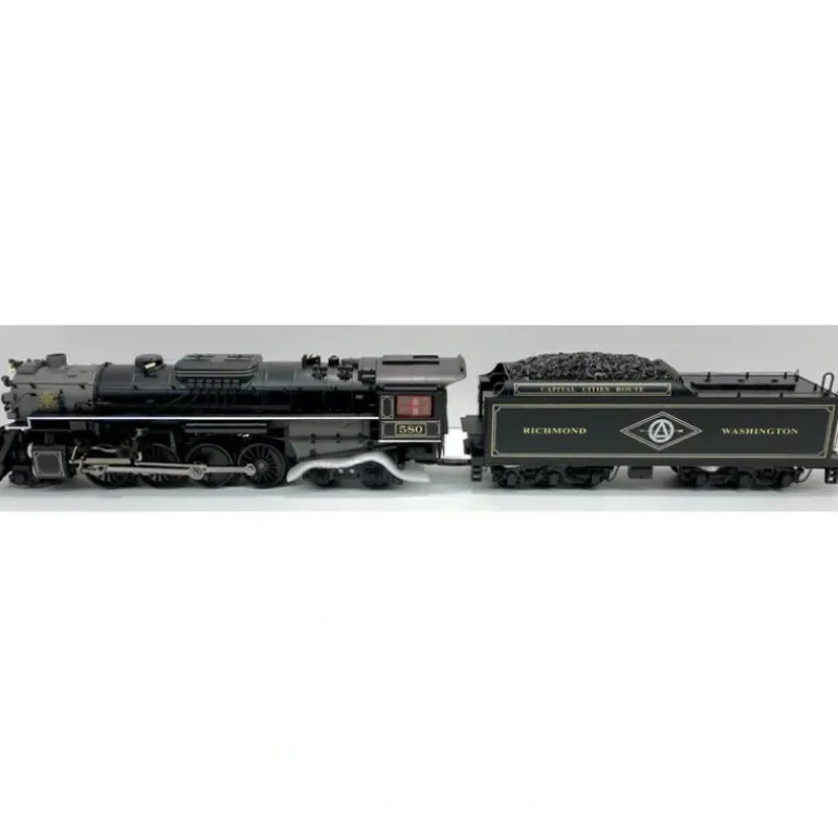 This is an MTH 20-3292-1 Richmond, Fredericksburg, and Potomac 2-8-4 Berkshire Steam Engine w/Proto-Sound 2.0 (Hi-Rail Wheels). The Nickel Plate’s 2-8-4 Berkshires belonged to one of steam’s finest family trees. The first 2-8-4, Lima Locomotive Works A-1, inaugurated the superpower era in 1925. A four-wheel trailing truck allowed the A-1 to have a larger firebox and boiler, producing a combination of power and speed never seen before in a steam locomotive. Initially tested on the Boston and Albany Railroad, the new wheel arrangement was dubbed the Berkshire after the mountain range it conquered on the B&A. At about the same time, the Van Sweringen brothers of Cleveland, Ohio assembled a group of railroads under their control, including the Chesapeake & Ohio, the Nickel Plate Road, the Pere Marquette, and the Erie Railroad. Under the leadership of talented designer John Black, an Advisory Mechanical Committee was formed to design engines for the Van Sweringen roads. The group turned out some of the finest locomotives of the super power era, and perhaps its crowning achievement was the Nickel Plate Berk, a 2-8-4 introduced in 1934 and called by steam historian Eugene Huddleston the greatest 2-8-4 ever to take to the rails. Engineers loved its looks, speed, power, and wonderful sound; as one recalled, It was a thrill to operate them. Intended for fast freight, the 700-series Berks could also take off with an 18-20 car WWII troop train. Features include Die-Cast Boiler and Chassis, Die-Cast Tender Body, 1:48 Scale Proportions, Authentic Paint Scheme, Metal Wheels and Axles, Constant Voltage Headlight, Die-Cast Truck Sides, Precision Flywheel Equipped Motor, Locomotive Speed Control, Proto-Scale 3-2 3-Rail/2-Rail Conversion Capable, Remote Controlled Proto-Coupler, Engineer and Fireman Figures, Operating Firebox Glow, Operating MARS Light, Metal Handrails and Decorative Bell, Decorative Metal Whistle, Operating Marker Lights, Lighted Cab Interior, Synchronized Puffing ProtoSmoker System, Operating Tender Back-up Light, Wireless Drawbar, Proto-Sound 2.0 With The Digital Command System Featuring: Freight Yard Proto-Effects, Unit Measures:26″ x 2 1/2″ x 3 7/8″, and it Operates On O-54 Curves.