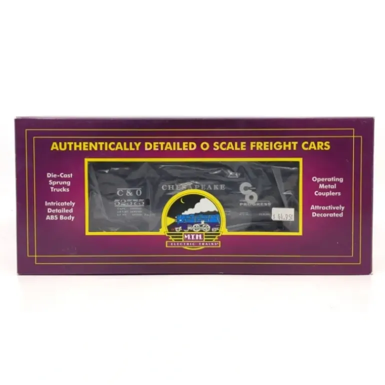 Here is an MTH 20-3420D O Gauge Chesapeake & Ohio 2-Bay Offset Hopper w/ Coal Load #52575. This car features die-cast metal sprung trucks, metal wheels and axles, and operating knuckle couplers.