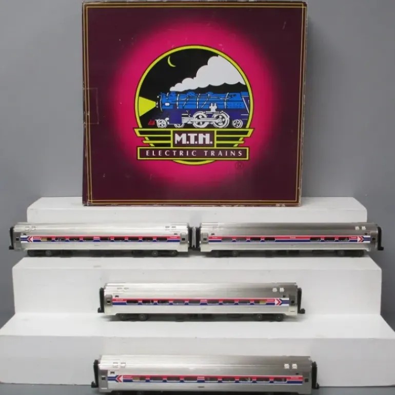 Here is an MTH 20-65142 Amtrak 4-Car Amfleet Passenger Set. Features for this set include: durable ABS intricately detailed bodies, metal wheels, metal axles, overhead interior lighting, die-cast 4-wheel trucks, operating die-cast metal couplers, colorful, attractive paint schemes, end of car diaphragms, separate metal handrails, fast angle wheelsets, needle point axles, detailed car interiors, detailed car undercarriage, and it operates on O-42 curves.