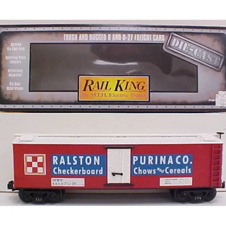 This is a MTH 30-8625 Ralston Purina Die-Cast Reefer Car. This car is all metal. It is from the Rail King line and will run through O31 curves. It also features die cast sprung trucks and operating couplers.