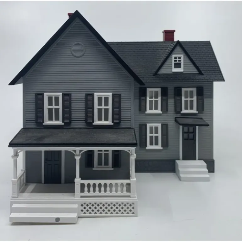 Here is a MTH Rail King 30-90054 O Gauge Farm House. This one is gray with a black roof, gray shutters and white trim. It features intricately Detailed ABS Construction, it comes fully assembled and fully painted, and has a lighted Interior! It measures 7 1/2 x 7 1/2 x 7 inches.