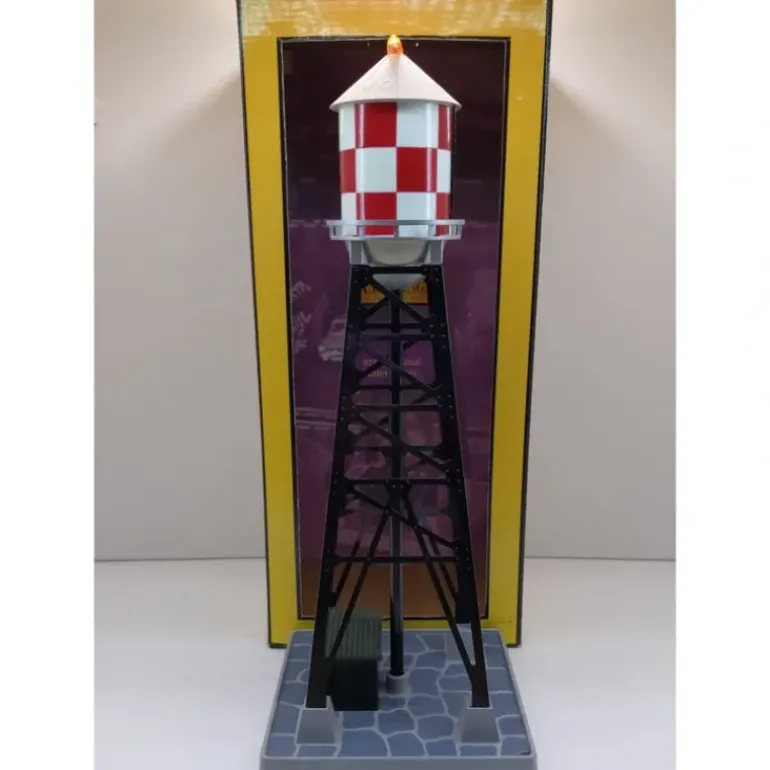Here is a MTH 30-9029 O Gauge #193 Checkerboard Industrial Water Tower from 1999-2000. It is very similar to the original Lionel 193 Tower from the mid 1950s. This one has a slightly different color scheme and features a blinking strobe light. This water tower measures approximately 15″ tall x 6 1/8″ wide at the base.