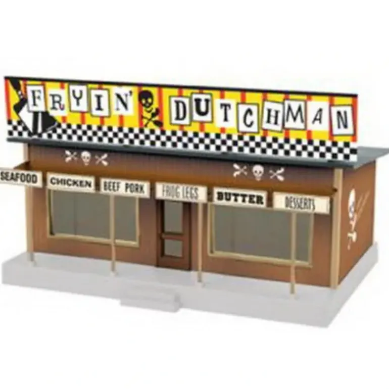 This is an MTH 30-90340 Fryin’ Dutchman Roadside Stand. M.T.H. Electric Trains offers a variety of RailTownT buildings to help you create whatever kind of atmosphere you desire; rural or urban, nostalgic or modern. Operating buildings transfer your layout’s action from trains to structures adding fun and excitement to the entire pike. RailTown buildings are a perfect addition on any O Gauge layout, as each is sized for use with all O Gauge locomotives and rolling stock regardless of manufacturer. Fully assembled and ready-to-use, M.T.H. accessories will transform your layout into a world of action in just minutes.