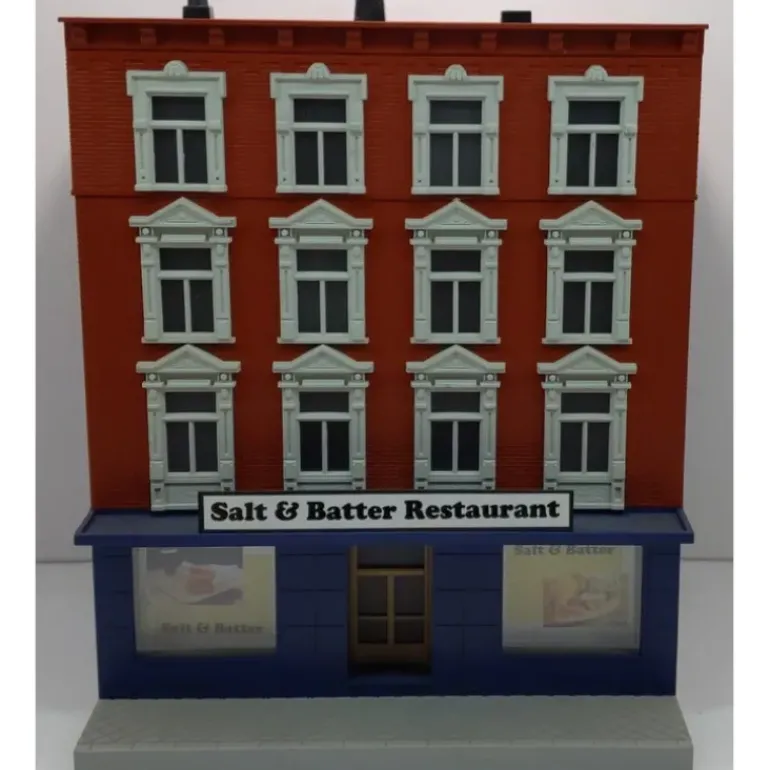 Here is an MTH 30-90348 Salt & Batter Restaurant 4-Story Building. It features intricately detailed abs construction with a lighted interior and measures approximately 9″ x 8.75″ x 13.5″.