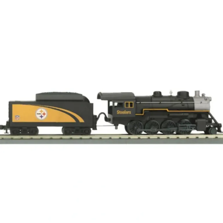 This is an MTH 33-1026-1 O Gauge Pittsburgh Steelers 2-8-0 Steam Locomotive & Tender with Proto-Sound 2.0. This colorful O-27 steam locomotive brings the rugged excitement of the NFL to model railroading for a unique and interactive family activity sure to spark memories of great NFL action. The powerful die-cast metal 2-8-0 Consolidation locomotive sports one of four famous NFL team colors and feels as strong in your hands as it runs on the track. Equipped with all-metal gears, wheels and axles ensures a lifetime of fun and the unique sounds of Proto-Sound 2.0 simply amaze friends and family. Imagine their faces when the whistle is activated but sounds the shrill of a referee’s whistle, or when the bell is triggered resulting in the introduction of the team. Even more impressive are our exclusive NFL Proto-Effects that play back classic radio play-by-play calls. Of course, seeing the synchronized puffing smoke from the locomotive as it pull whatever you put behind it is even more impressive and tells all who see it that this is one great locomotive. Features include Die-Cast Boiler and Chassis, Near Scale Sizing, ABS Detailed Tender Body, Die-Cast Metal Chassis, Colorful Paint Scheme, Metal Wheels and Axles, Constant Voltage Headlight, Precision Flywheel Equipped Motor, and Locomotive Speed Control.