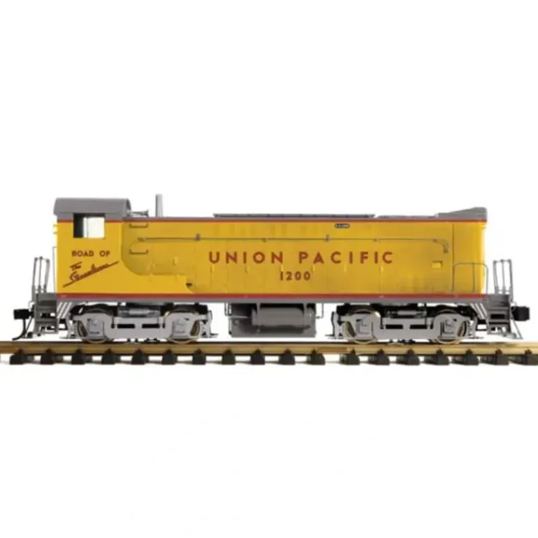 This is an MTH 70-2048-1 Union Pacific VO 1000 Diesel Engine. It features directionally controlled headlights, metal wheels, metal axles, metal gears, two remotely controlled Proto-Couplers, two precision flywheel equipped motors, locomotive speed control, two cab figures, lighted cab interior, illuminated number boards, lighted front marker lights, spinning roof fans, metal body side grilles, an operating smoke unit, and it operates on R-1 curves.