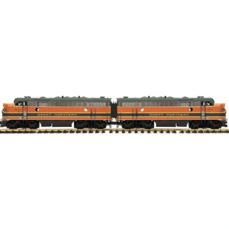Here is a MTH 70-2091-1 Great Northern F-7 A Unit Diesel with Proto-Sound 2.0. This engine features two precision flywheel motors, ProtoSmoke system, locomotive speed control, operating cab interior lighting, lighted number boards, marker lights and constant voltage directionally controlled headlights, detailed cab interior with engineer and fireman figures, spinning roof fans, remotely-controlled proto-Couplers, opening doors and a fixed pilot. It runs on R1 track and can be used indoors or outdoors. It measures approximately 19 3/4″ long and bears road number 454A.