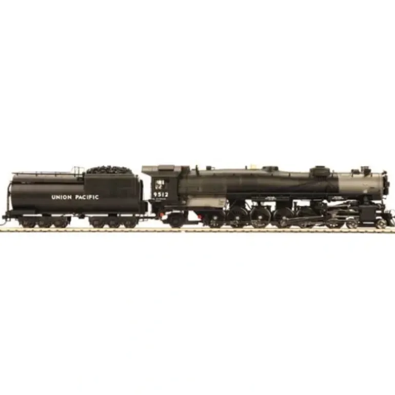 This is an MTH 80-3155-1 Union Pacific 4-12-2 Steam Locomotive #9512. It features a die-cast boiler and tender body, die-cast metal chassis, authentic paint scheme and cab numbers, RP-25 metal wheels mounted on metal axles, operating marker lights, constant voltage lighting, detailed trucksides, detailed cab interior, powerful 5-pole precision flywheel equipped motor, two Kadee compatible scale couplers, metal handrails, decorative bell, decorative metal whistle, sprung drive wheels, synchronized puffing ProtoSmoker system, locomotive speed control, locomotive cab to tender deck plate, detailed tender undercarriage, interchangeable traction tire equipped drive wheels, on board DCC receiver, and it operates on code 70, 83, and 100 rail curves.