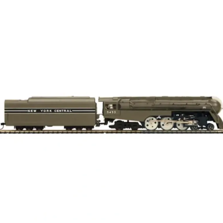 This is an MTH 80-3164-1 New York Central 4-6-4 Dreyfuss Steam Engine w/Proto-Sound 3.0. It features a die-cast boiler and tender body, die-cast metal chassis, authentic paint scheme and cab numbers, RP-25 metal wheels mounted on metal axles, operating marker lights, constant voltage lighting, detailed trucksides, detailed cab interior, powerful 5-pole precision flywheel equipped motor, two Kadee compatible scale couplers, metal handrails, decorative bell, decorative metal whistle, sprung drive wheels, synchronized puffing ProtoSmoker system, locomotive speed control, locomotive cab to tender deck plate, detailed tender undercarriage, interchangeable traction tire equipped drive wheels, on board DCC receiver, and it operates on code 70, 83, and 100 rail curves.