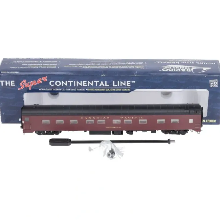This is a Rapido Trains 104037 HO Scale Canadian Pacific Brookdale Super Continental Line(TM) 10-5 Sleeper. Rapido Trains Super Continental Line HO streamlined passenger cars are welcome additions to many passenger consists. These detailed, ready-to-run models feature interiors, working diaphragms, factory-installed grab irons and battery-operated interior lighting and knuckle couplers.