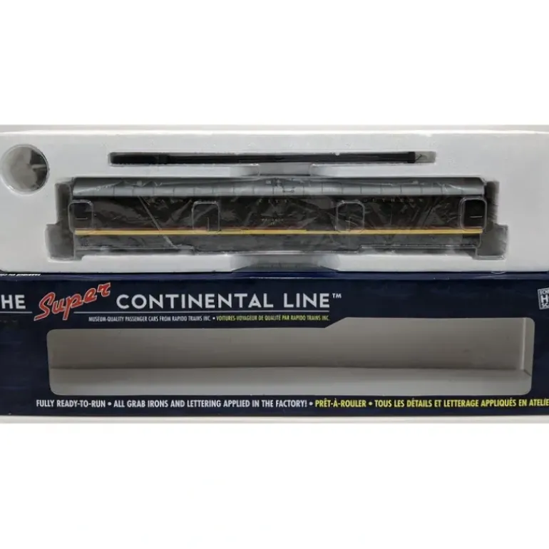 This is a Rapido Trains 106134 HO Scale Kansas City Southern Super Continental Line(TM) 73′ 6 Smooth Side Baggage-Express Car #17.Based on prototypes constructed in Canada by National Steel Car, these cars are very similar to cars used by a number of U.S. roads. Features include full underbody details and piping, separately applied wire grab irons and handrails, hand brake chains, battery-operated interior lighting, operating baggage doors, interiors and different door styles as appropriate.