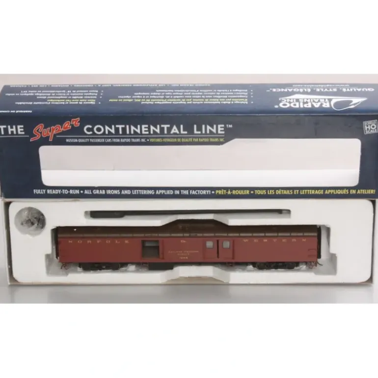 This is a Rapido Trains 106156 HO Scale Norfolk & Western Super Continental Line(TM) 73′ 6 Smooth Side Baggage-Express Car #1288.Based on prototypes constructed in Canada by National Steel Car, these cars are very similar to cars used by a number of U.S. roads. Features include full underbody details and piping, separately applied wire grab irons and handrails, hand brake chains, battery-operated interior lighting, operating baggage doors, interiors and different door styles as appropriate.