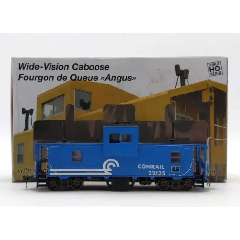 This is a Rapido Trains 110085 HO Scale Conrail Transcona Yard Wide Vision Caboose Lighted & Assembled #22135. This car features plastic construction, plastic trucks, metal wheels, plastic axles, and knuckle couplers.