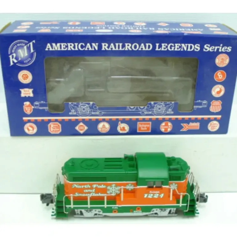 Here is a RMT 4501 O Rudolph BEEP Powered Diesel Locomotive #1224. RMT Beeps are very popular amongst model train lovers. The BEEP is modeled after GEEPs (GP-9s),and condensed into a smaller baby-sized version of your traditional O gauge diesels. Dont let its size fool you, this engine has the pulling capacity of your standard O gauge engines. Features include dual can motors, an electronic 3-position forward-neutral-reverse unit, directional lighting, dual roller power pickups, operating metal knuckle couplers, metal railings, decorative horns and metal wheels. It is compatible with all Lionel, K-line, MTH, Atlas, Williams and Weaver electric trains and is perfect for use on all O and O-27 3-Rail model train layouts . It is 9.5 Inches long and operates on minimum O-27 curves.